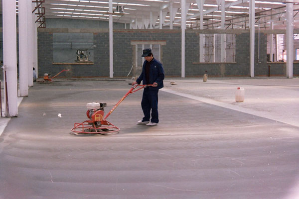 4、收光:待地面接近終凝時,將抹光機的原盤去除,使用機械抹刀隨著地面的硬化進程,對地面進行3—4次的收光。
